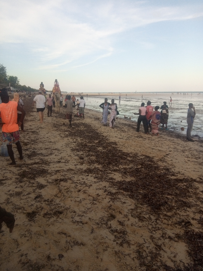 The image portrays a crowded beach scene in Shanzu ward, Kenya