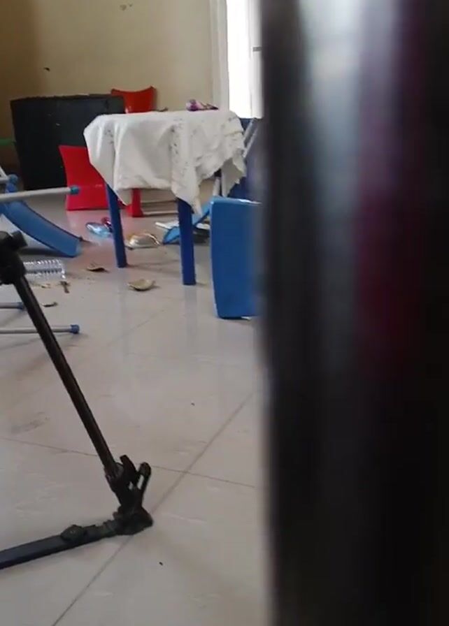 room that appears to have been vandalized. There are overturned chairs in various colors (blue, red, and orange) scattered across a light-colored tiled floor. A small table is also overturned, with a white cloth draped over it partially on the floor. There is food or some other debris spilled on the floor. There is a green rectangular object, possibly a part of a table or play structure, is standing upright. A tangle of wires and a piece of equipment is visible in the foreground. The background includes a serving counter and a doorway. The overall scene suggests a recent disturbance or act of vandalism. No people are visible in the video.