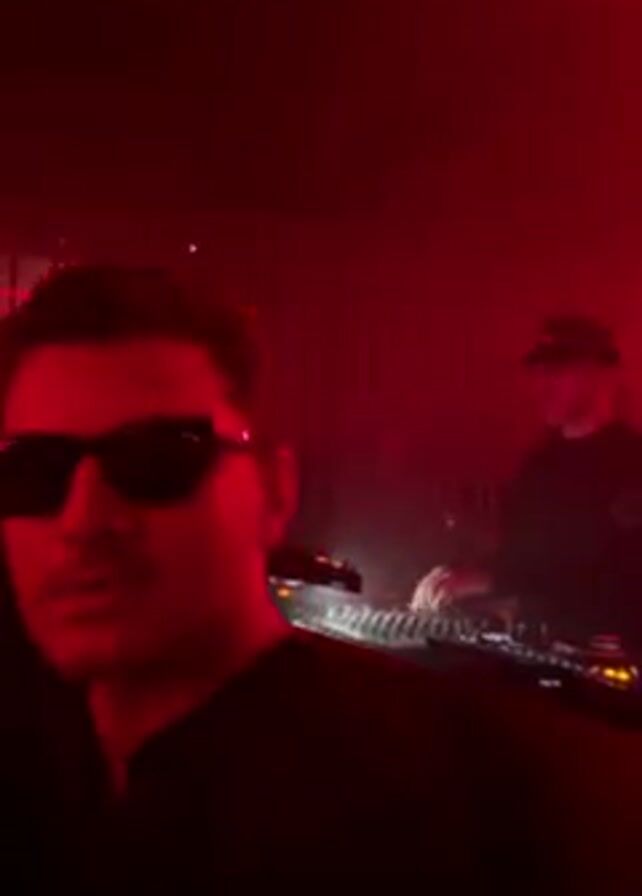 A dimly lit nightclub features a DJ performing, observed by a person with sunglasses in the foreground