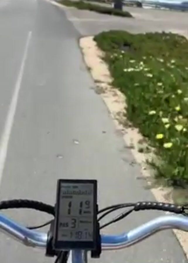 first-person perspective of someone riding an electric bicycle on a paved path next to the ocean