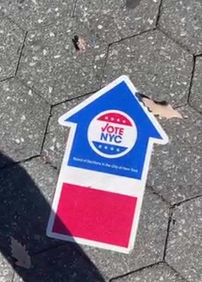 n arrow sign on a gray brick surface, pointing towards an old brick building. The sign has the words "Vote NYC" in white on a blue background. The lower half of the sign is red. The building is made of red brick and has arches and a flagpole. There are signs at the base of the pole that say "Vote Here".