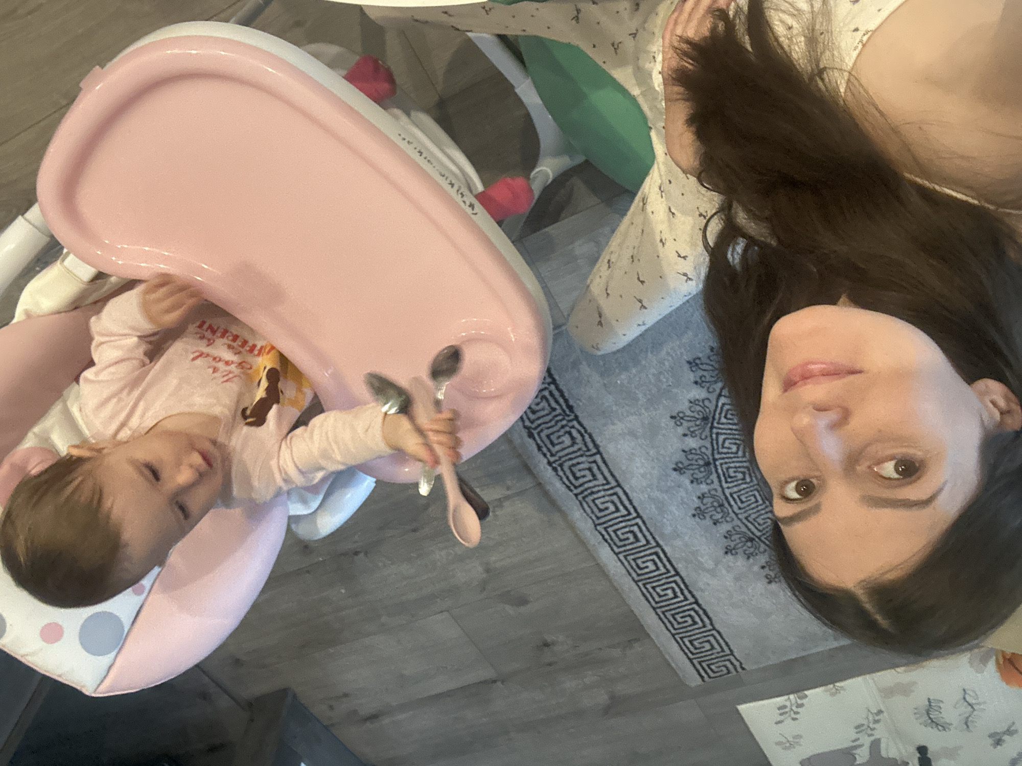 The image depicts an indoor scene within a residence in Wisła, Poland. From an elevated, downward perspective, a partial view of a female adult with dark hair is visible in the lower right quadrant, looking directly towards the camera. She is wearing light-colored, patterned trousers. In the upper central portion, an infant or toddler with light brown hair is seated in a pink and white high chair equipped with a solid pink feeding tray. The infant wears a light pink long-sleeved shirt featuring a brown graphic and text, and is holding two metallic spoons and one pink plastic spoon in their right hand above the tray, with their gaze directed downward. The floor consists of gray wooden laminate planks. A gray area rug with a black Greek key border pattern and central floral motifs is positioned beneath the high chair and the visible legs of the adult. A second, light-colored patterned rug is partially visible in the lower-left corner.