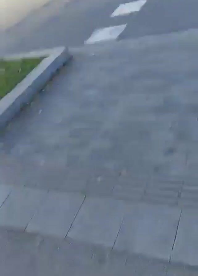 street scene in a European city, likely Barcelona, Spain. The camera is positioned at street level, capturing a crosswalk with gray brickwork in the foreground. Across the crosswalk is an asphalt street with a painted dotted line indicating a pedestrian lane. Cars of various makes and colors are parked along the street. A black hatchback car drives across the crosswalk from left to right. Trees line the street, and apartment buildings are visible in the background. A street lamp and a trash can stand near the crosswalk. Further down the street, a traffic light displays a green "walk" signal. The weather appears sunny.