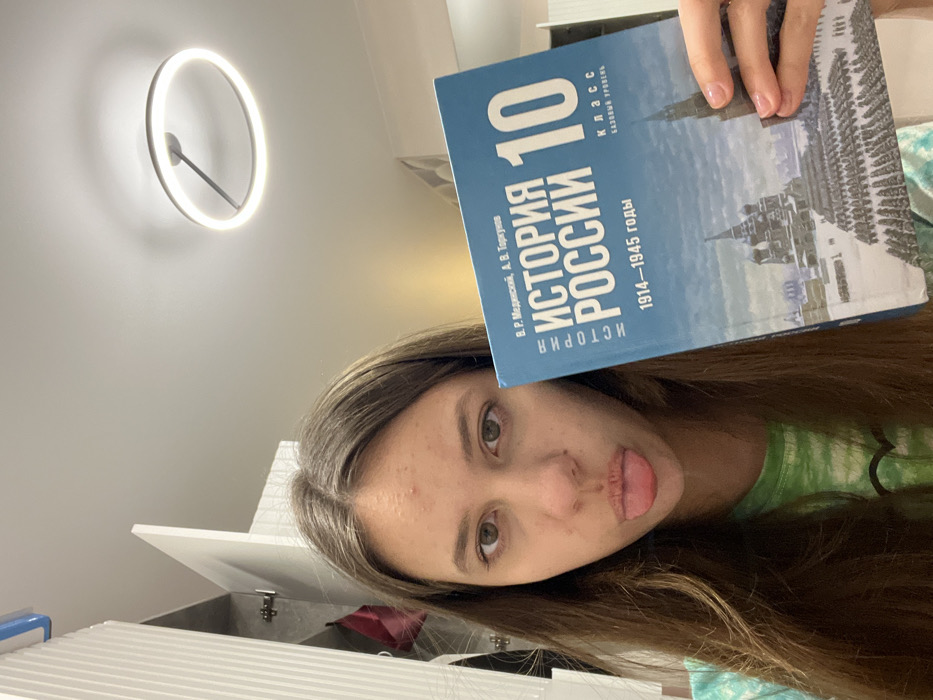The scene is depicted indoors, described as occurring in the city of Ketoshi, Russia. Visual evidence, specifically the Russian-language textbook, supports a location within Russia, though the specific city is not discernible from the image. A young female individual, appearing to be in her late teens or early twenties, is positioned centrally in a mid-shot. She has long, dark brown hair parted in the middle and fair skin, with visible minor blemishes on her forehead. Her eyes are light brown. She is wearing a green and white patterned or tie-dye t-shirt. The individual is looking directly at the camera with her tongue extended out of her mouth in a playful or informal gesture. She holds a blue textbook in her right hand, positioned to the right of her face. The textbook cover displays the title "ИСТОРИЯ РОССИИ 10 КЛАСС 1914-1945 годы" (HISTORY OF RUSSIA 10th GRADE 1914-1945 years), listing authors В. Р. Мединский and А. В. Торкунов, and indicating "БАЗОВЫЙ УРОВЕНЬ" (BASIC LEVEL). The cover illustration features a winter scene with St. Basil's Cathedral and a formation of troops. The background consists of a plain light-colored ceiling with a modern, circular LED light fixture that is illuminated. To the left, a white cabinet or wardrobe with a partially open door is visible. The walls are light-colored. The overall environment suggests a private residence or a student's room.
