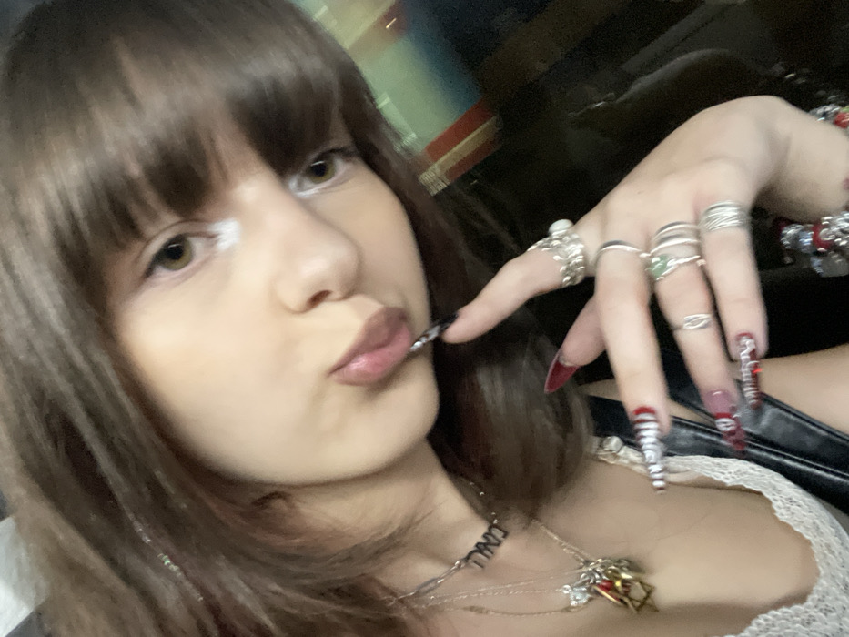 A woman with brown bangs and tan skin pouts at the camera, wearing several silver rings and layered necklaces. Her nails are long and elaborately decorated, some with red tips and others with a black and white design. She wears a white lace top and a black leather jacket. The lighting is slightly dim, giving the image a slightly grainy quality.