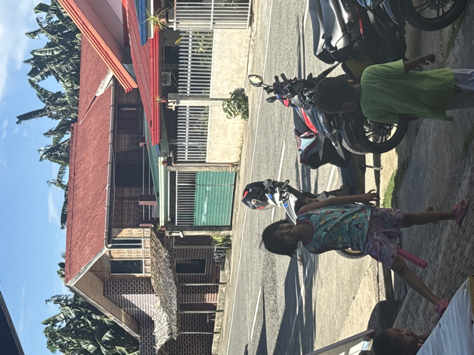 The image depicts a street scene in Burgos, Philippines, under bright daylight. In the immediate foreground, a paved concrete surface shows two children and several parked motorcycles. A young girl with short dark hair, wearing a light blue patterned tank top, pink shorts, and pink flip-flops, stands smiling towards the camera with her left leg extended backward. To her right, a young boy in a green t-shirt and light-colored shorts stands mostly with his back to the camera, facing the right side of the frame. A third child's head is partially visible at the bottom left of the frame, resting on a white surface. Three motorcycles or scooters are parked on the right side of the paved area. A white and black scooter in the center foreground has a black motorcycle helmet resting on its handlebars. To its right, a black scooter is draped with a red and blue fabric item over its seat. Strong shadows from an unseen structure are cast across the foreground pavement. A dark gray paved road with a white center dividing line separates the foreground from a row of residential structures. Across the road, on the left, stands a two-story house with a red corrugated metal roof. Its upper story features a light-colored brick facade with windows, while the lower story has a similar brick facade and a thatched roof extension over a porch area, supported by brick columns. Adjacent to it, partially obscured by a white concrete fence, is a section of a house with a green roof, fronted by a green metal gate. To the right, another house with a red corrugated metal roof is visible, fronted by a white concrete fence topped with several potted plants. Dense tropical foliage, primarily banana trees, rises behind the houses against a clear blue sky.