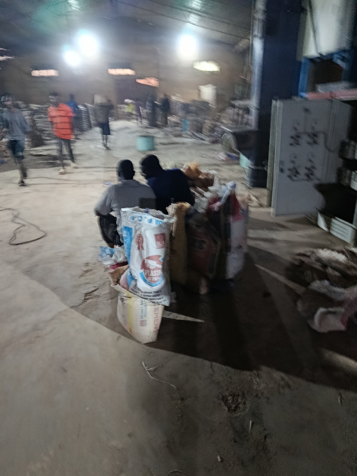 Inside a dimly lit warehouse, two men sit amongst several bags of materials. In the background, numerous individuals are walking and working, while other materials and supplies are scattered around. The room is large, with a high ceiling and inadequate lighting, creating a low-lit environment. Several bright lights hanging from the ceiling and through the windows give some visibility.