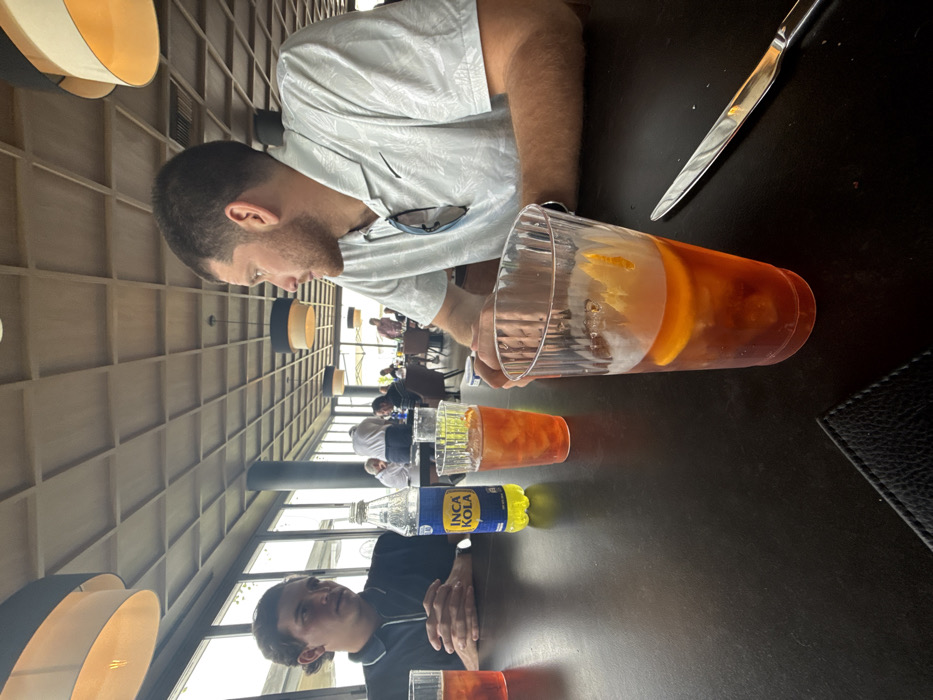 Two men are at a restaurant table. One wears a white shirt and sunglasses, while the other wears a black shirt. A pitcher of orange drink sits on the table with a filled glass and a bottle of Inca Kola. A knife and a black placemat are also visible. The restaurant has a high ceiling with rectangular panels and modern hanging lamps. Other patrons can be seen in the background, seated at various tables.