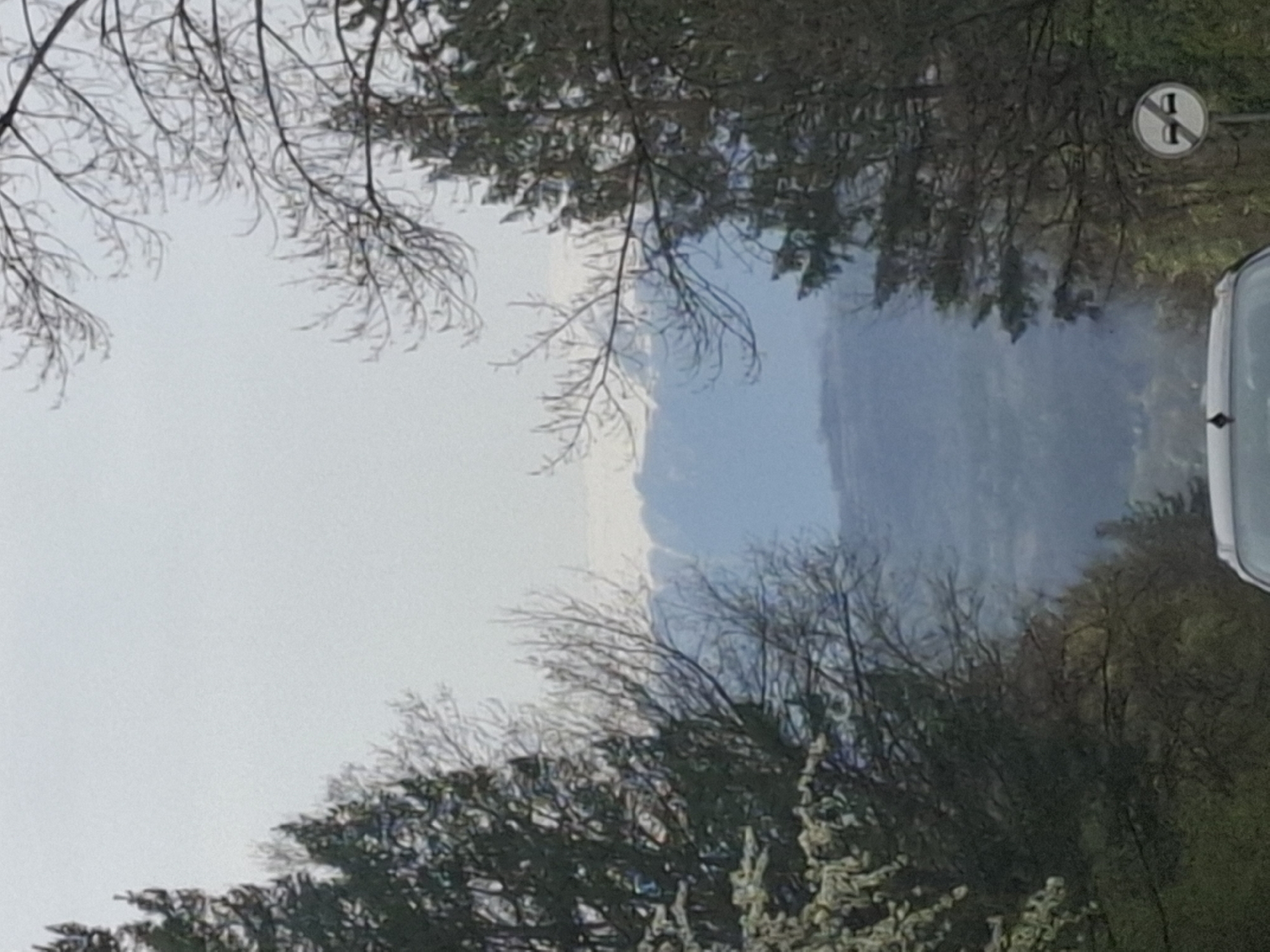 The image, taken near Borovtsi, Bulgaria, shows a hazy vista framed by trees. In the foreground are the branches of trees, some bare and some with new spring blossoms. Through the trees, a view of hills or mountains is seen, shrouded in a light blue haze. A no vehicles sign is visible, along with part of a vehicle, probably on the roadside.