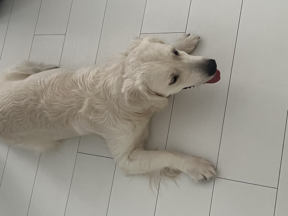 - "A golden retriever sprawls on a light-colored, plank-style floor" by FM-mWrWX2, licensed under CC BY 4.0