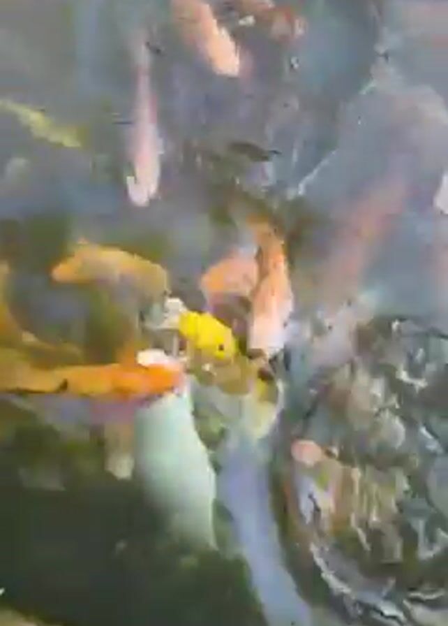 group of fish swimming in a pond. The fish are of various colors, including orange, yellow, white, and pink. The water is a bit murky, and some green plants are visible in the bottom of the pond. The fish are swimming close together, and the water is rippling from their movement.