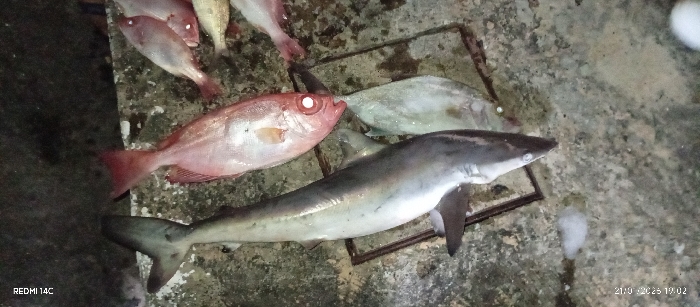 A collection of various fish lies on a textured surface. At least six fish are visible, including a shark in the foreground with grey skin and a pointed snout. Other fish appear pink or white. Some are arranged around a square metal frame or grate. The scene is dimly lit, with timestamp "21/09/2023 19:02" visible in the bottom right corner, and "REDMI 14C" in the bottom left corner.