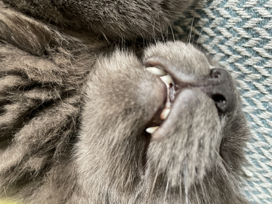- "The image displays a close-up, inverted view of a gray domestic cat resting on its back, located in Boreti, Montenegro" by FM-GgSpJ3, licensed under CC BY 4.0