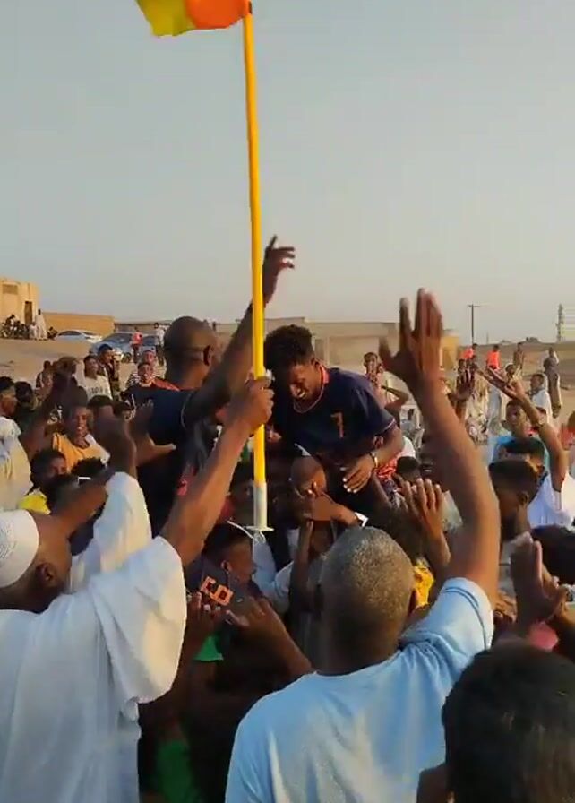 A crowd of people is gathered in an open area, likely a field or rural setting, under a bright, clear sky. At the center of the crowd, two men are being hoisted up, one of whom is holding a long yellow pole with a yellow and orange triangular flag on top. The crowd appears to be celebrating or cheering, with many individuals raising their arms in the air. Some people are wearing traditional white clothing, while others are in more casual attire. In the background, there are some buildings and parked cars visible, suggesting a nearby village or town.