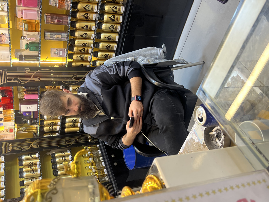 The image depicts an indoor scene within a retail fragrance shop in Barza Municipality, Syria