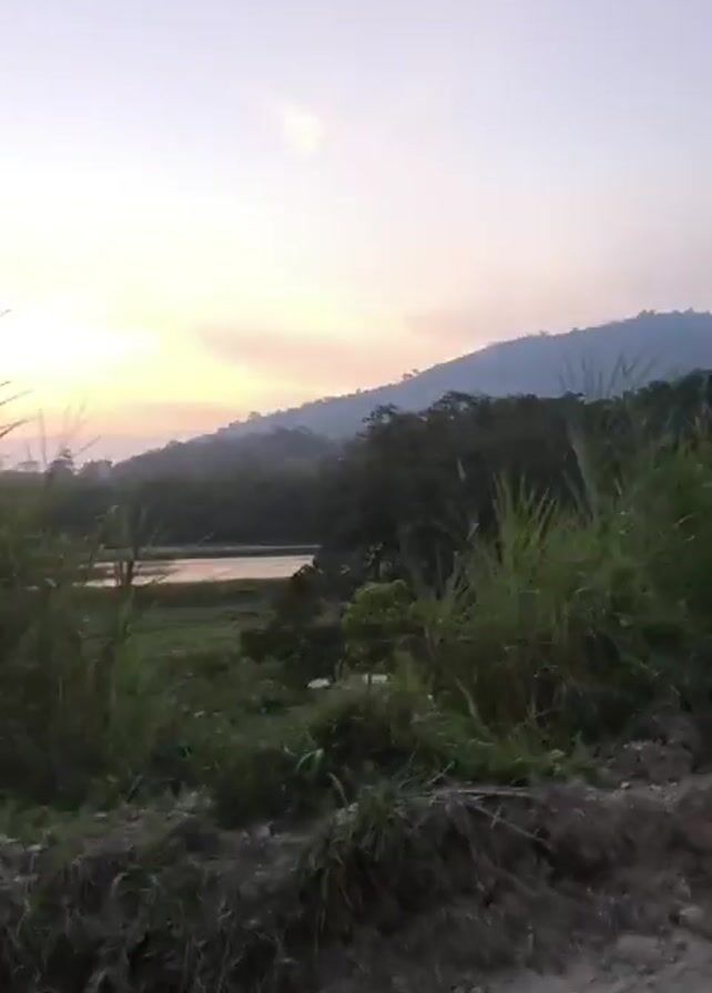 landscape at dusk. The camera moves along a dirt road with vegetation on the side. In the distance, there is a body of water reflecting the orange and yellow light of the setting sun. Mountains are visible in the background. The image is somewhat blurred due to the camera movement.