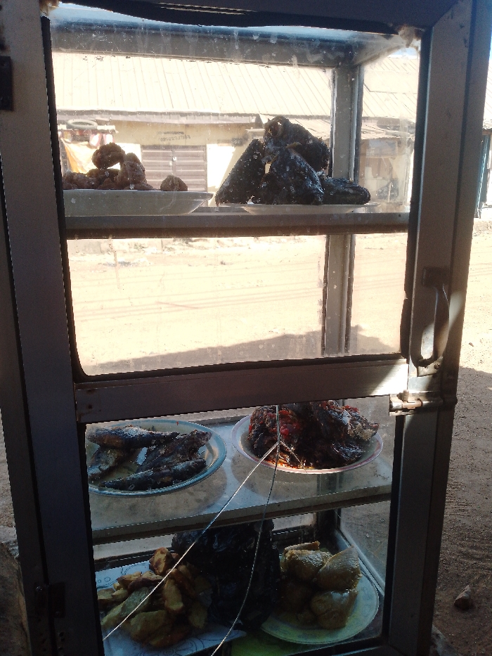 An outdoor, eye-level shot captures a four-tiered glass display case containing various prepared food items, situated in the city of Unknown, Unknown. The display case features a metal frame with visible wear and a handle on the right side. The top shelf holds two white plates: the left contains several light brown, irregularly shaped items, possibly fried snacks; the right contains dark, similarly shaped items. The middle shelf also presents two white plates: the left displays several whole, grilled or fried fish with visible seasoning; the right contains dark meat, likely fish or chicken, covered in a red sauce, with a metal utensil partially submerged. The bottom shelf features two white plates: the left holds golden-brown fried potato or yam wedges; the right contains several light brown, rounded food items, possibly steamed cakes or dumplings. Through the glass panels of the display case, a dusty, unpaved road or ground surface is visible in the background. Beyond the road, several simple structures with corrugated metal roofs are present, along with a partially visible yellow banner or tarp. The lighting indicates a bright, daytime setting. No individuals are visible in the scene.
