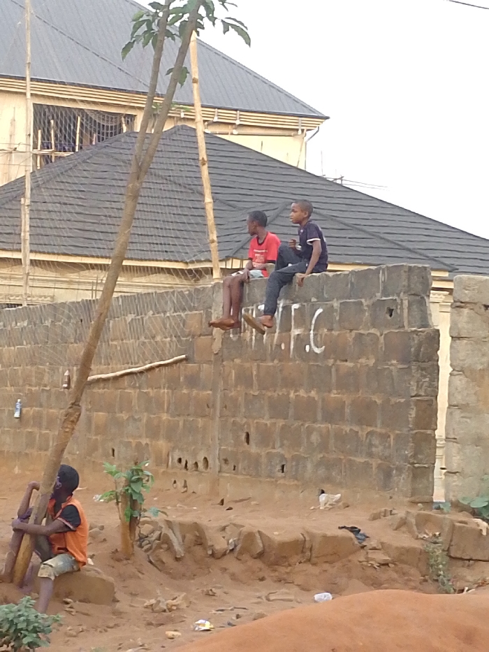 Two boys sit on a gray block wall with white graffiti. A third boy sits on the ground holding bamboo-like sticks. Behind the wall, a multi-story house with a dark gray roof looms. The ground is dirt and grass, with trash scattered around. A young tree stands in front of the wall. A small chicken pecks at the ground near the wall.