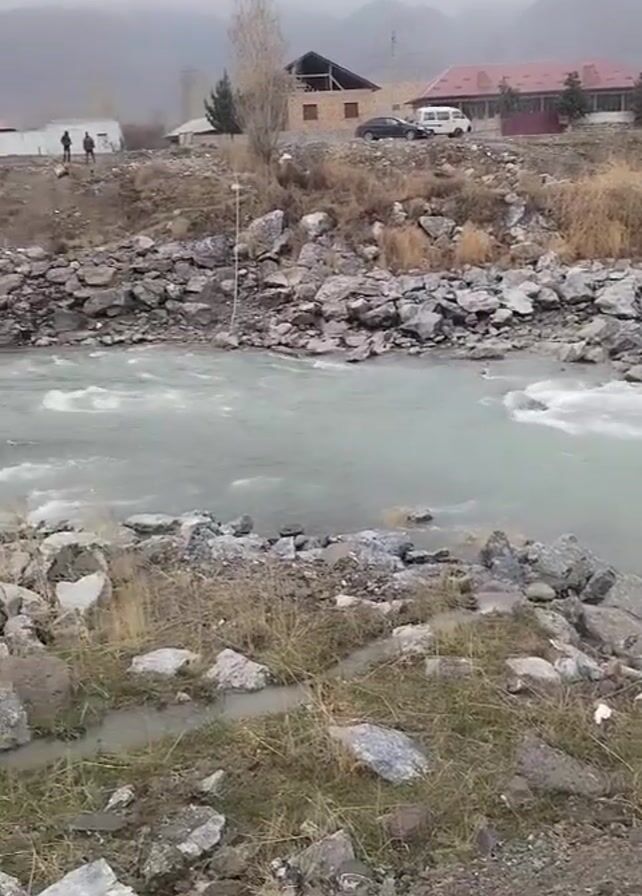 The video captures a view of a wide, rocky river with rapidly flowing water. The water appears slightly murky. In the background, there are some buildings and a mountain range obscured by a misty, overcast sky. On the riverbank, the ground is rocky and sparse vegetation is visible. A person wearing dark clothing walks across the river using a pole for balance. Further up on the bank near the buildings, there are two more people standing. A car and a van are also parked near the buildings.