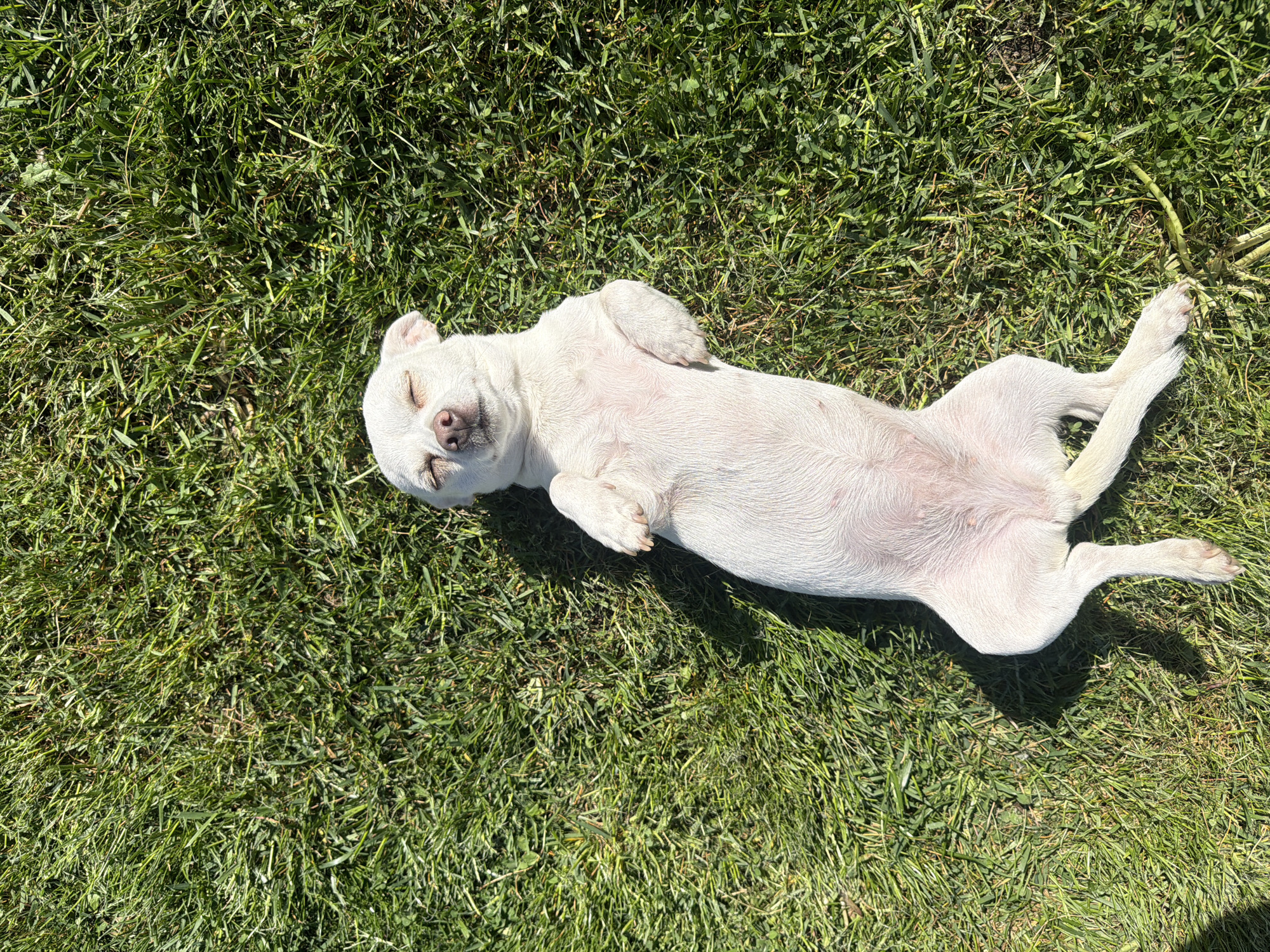 - "A white dog, possibly a chihuahua mix, is lying on its back in a grassy area" by FM-p6K6s2, licensed under CC BY 4.0
