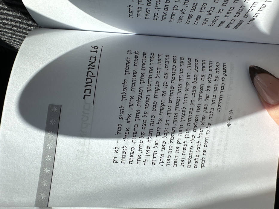 The image displays a close-up, top-down view of an open book held by a person's hand in Kafr Kasim, Israel. The book's pages are white, with the left page prominently featuring a heading in Hebrew that translates to "16 October," followed by columns of Hebrew text. A grey decorative strip with white asterisk patterns is present across the top left edge of the left page. The right page also contains visible Hebrew text. A distinct, dark, curved shadow extends across the upper half and center of both pages, partially obscuring text and the decorative strip, indicating strong directional lighting from an unseen source. A human hand, with fingernails painted with dark tips, is visible at the bottom right corner, holding the book open.