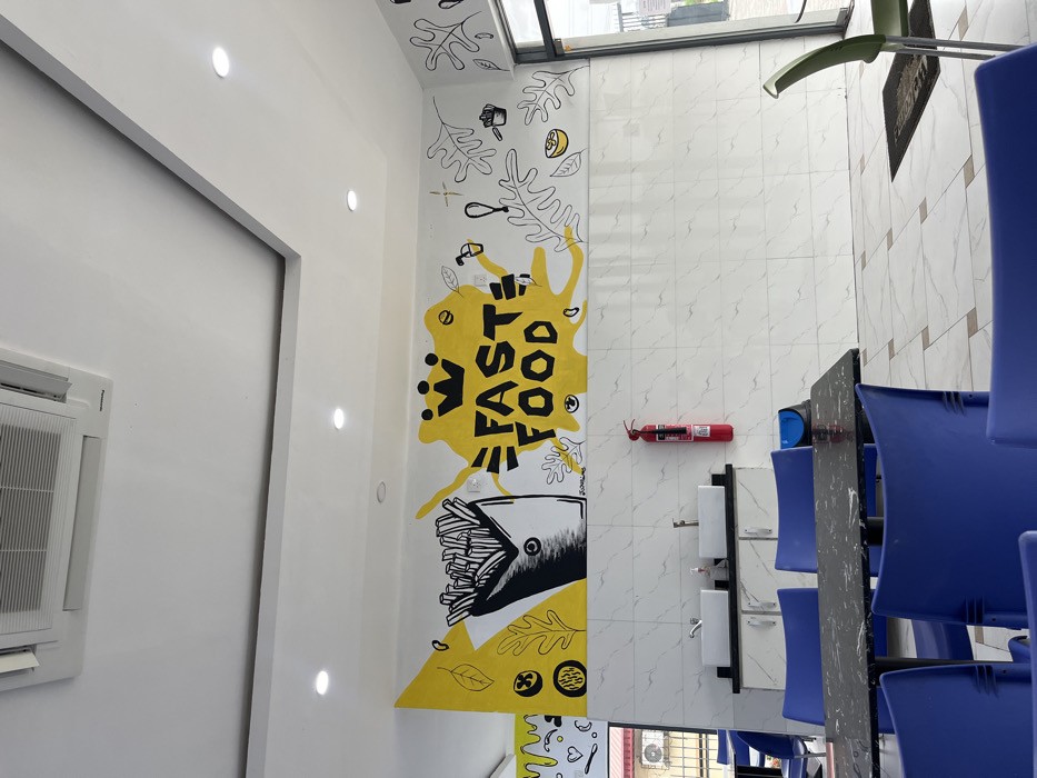 The photo shows a fast-food restaurant interior with white walls, tile floors, and blue chairs. A decorative mural on the wall features hand-drawn graphics with the words "FAST FOOD" in yellow. A fire extinguisher is mounted on the wall. A sink and counter area is nearby. The ceiling has recessed lighting. The image is taken from a slightly skewed angle.