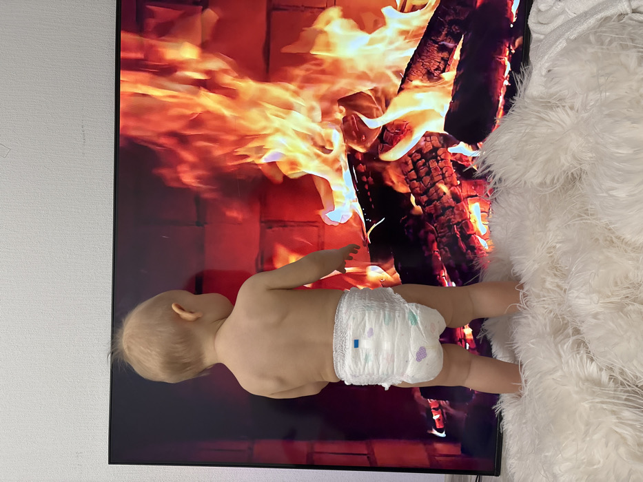 A baby, wearing a diaper, lies on a fluffy white surface facing a television. The screen displays a warm, simulated fireplace scene with flickering flames and burning logs. The baby's back is visible, showcasing a fair complexion and light-colored hair. The juxtaposition of the cozy virtual fire and the innocent child creates a calming, domestic scene.