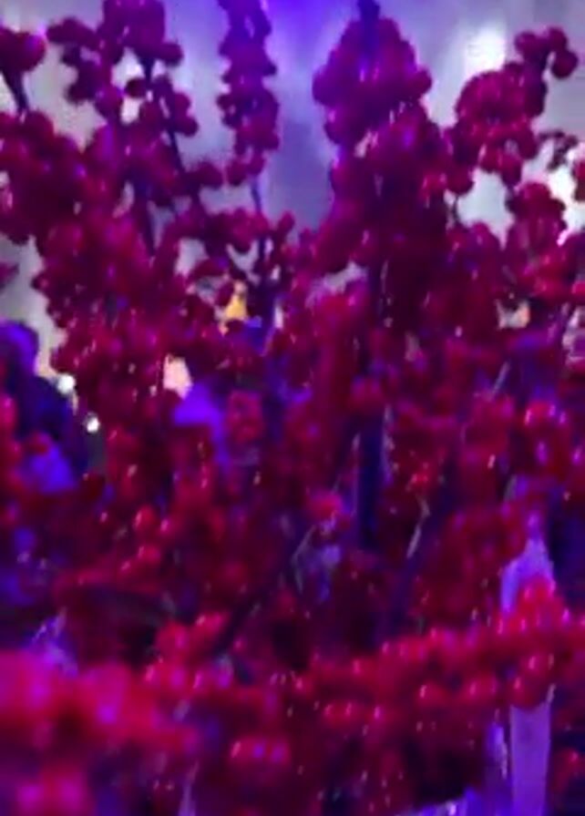 The video opens with a close-up of a silver vase filled with branches laden with bright red berries, adorned with decorative clear icicles. The shot gradually widens, revealing a live band performing on stage. The stage is set with white draping that gives a cloud-like effect, and illuminated by blue stage lights. An audience of people, mostly dressed in dark clothing, can be seen standing in front of the stage, partially obscured by the berry-filled branches in the foreground. The band consists of several members, including a lead singer with a microphone, and what appear to be supporting musicians.