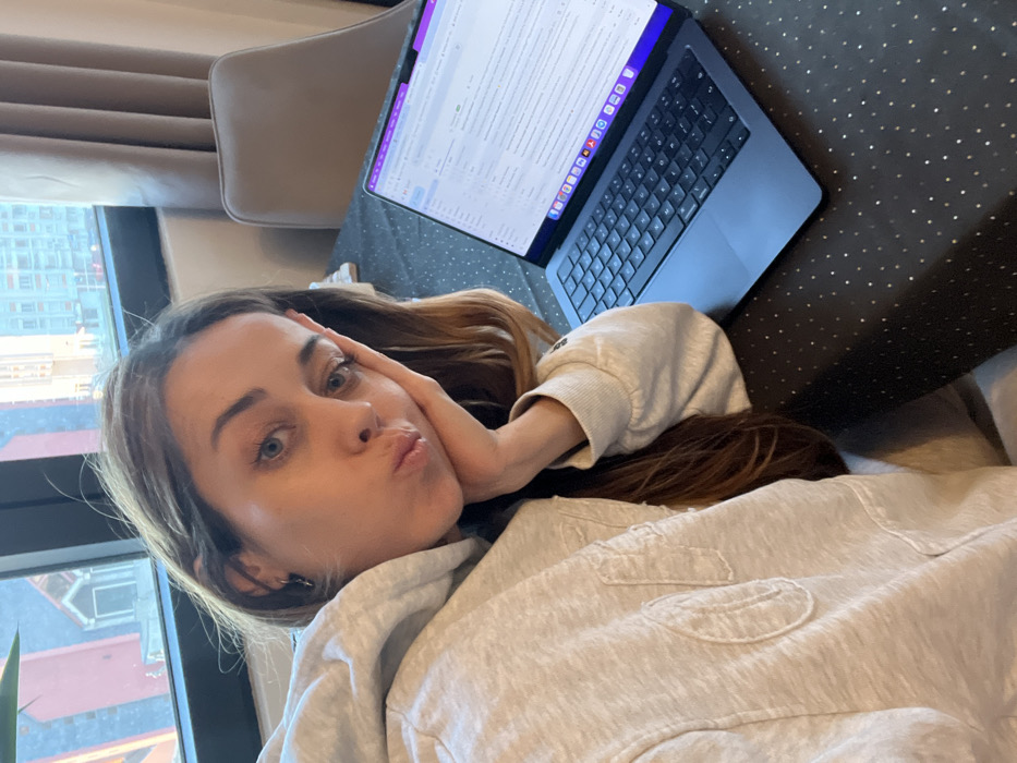 A woman in a light gray sweatshirt poses in front of a laptop on a dark, patterned surface. She rests her cheek on her hand, making a kissing face toward the camera. The laptop screen displays lines of text. A window with a cityscape is visible in the background. The scene is lit with natural light. The woman has long brown hair and blue eyes.