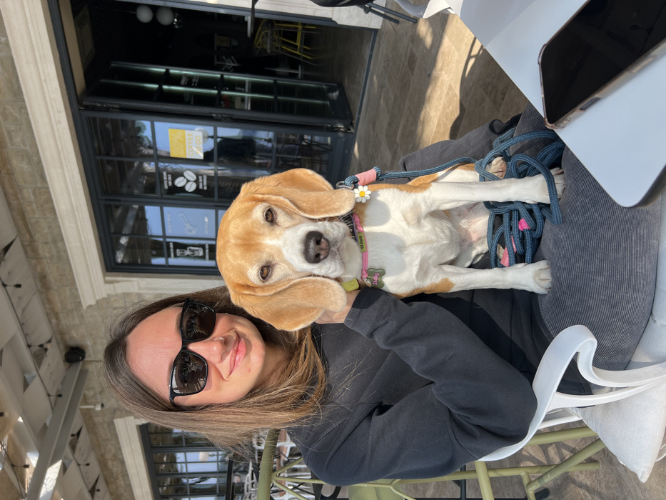 A female individual is seated outdoors at a cafe in Bečići, Montenegro, holding a tricolored Beagle dog on her lap