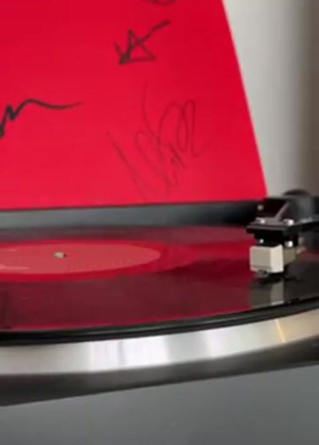 A record player is playing a vinyl record, the album cover for which is red and features a black peace symbol, an arrow, and an illegible signature