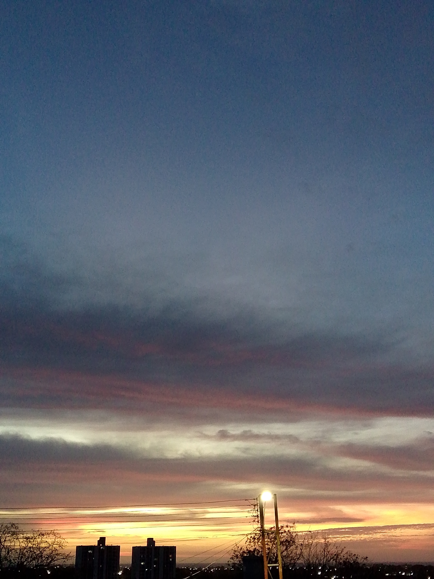 The image captures a twilight scene in Juan Griego, Venezuela. The sky is a gradient of deep blue at the top, transitioning to hues of pink, orange, and yellow near the horizon. Several layers of clouds are visible, with some tinged with shades of pink and purple. Silhouetted against the bright horizon are a few buildings and trees. A street lamp in the foreground casts a bright glow, illuminating the surrounding area. Overhead power lines are also visible.