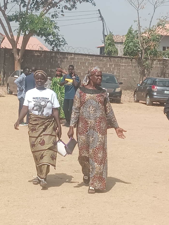 Two women walk towards the camera, one wearing a white t-shirt with a graphic and a brown patterned skirt, the other in a long patterned dress and headscarf. Both carry small bags. Behind them, several people are visible, one on the phone. Cars are parked in the background near a brick wall topped with barbed wire. A tree with bare branches stands to the left. The ground appears to be sandy or dirt. The scene is bathed in bright daylight.