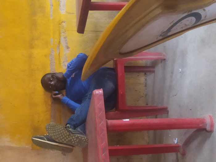 An adult male is observed indoors, seated in what appears to be a basic commercial establishment