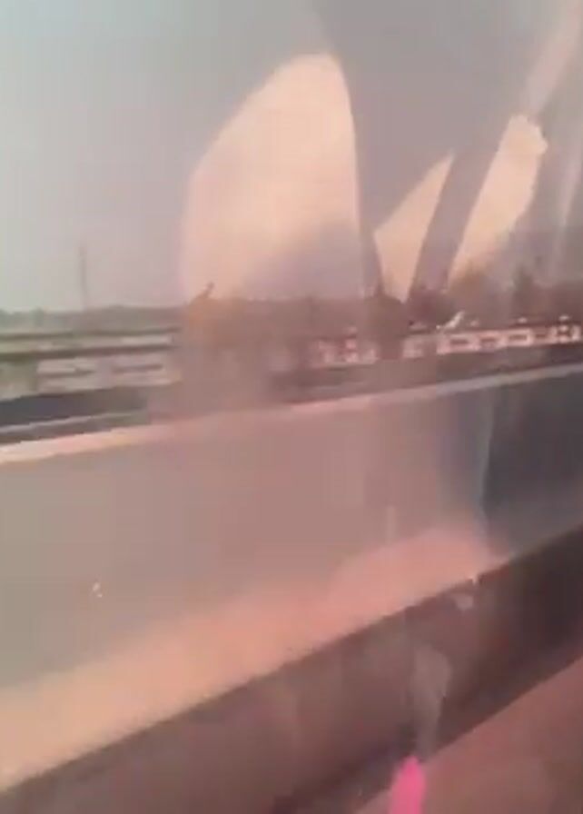A car is driving next to a flatbed truck carrying metal beams. The car passenger is filming the truck from the side window. The flatbed truck passes the car. The view shows the driver and the car interior, including a rear view mirror. The landscape is visible in the distance.