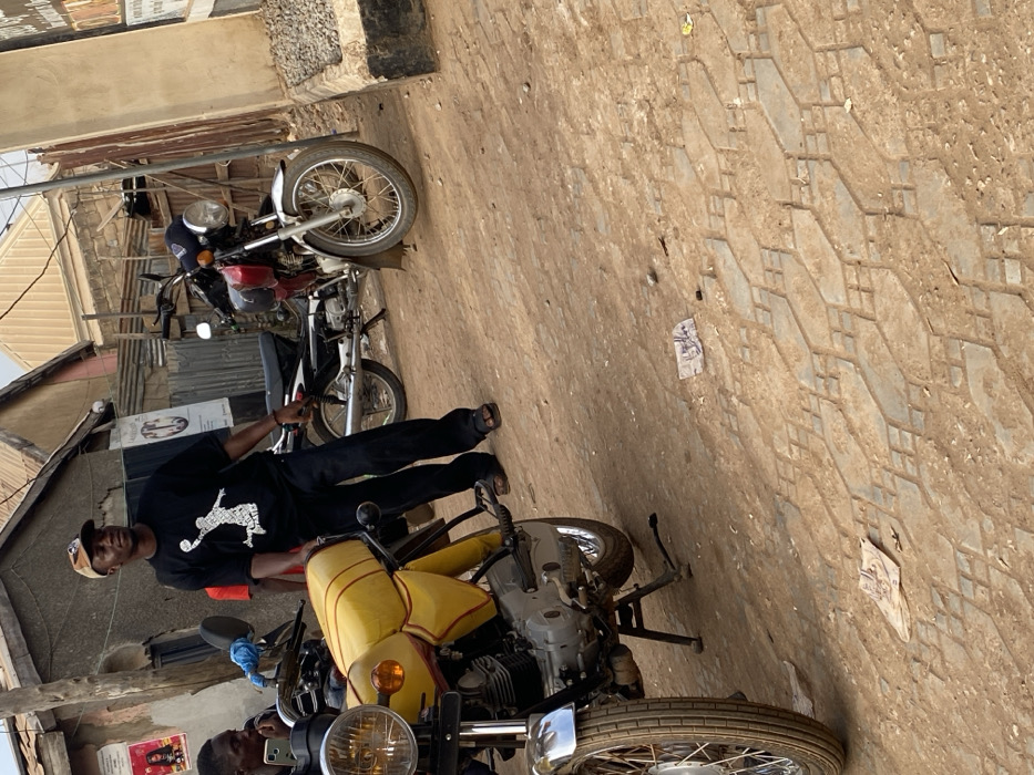 Two African men and three motorcycles dominate a dirt ground with a patterned texture. The closest motorcycle has a yellow seat and headlight. A man in a black shirt with a white logo stands beside it. Behind him, another man peers out from the front. In the background, another motorcycle, partially red, is parked with another motorcycle behind it. Buildings are visible in the background with a clear sky in the far distance.