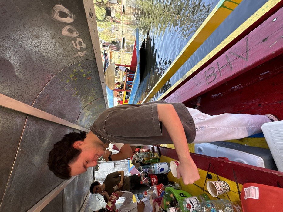 A boat scene with passengers and beverages. A man is standing inside the boat, smiling, with other people seated and lying down. Bottles of various drinks are scattered around. The boat's interior features a curved metal ceiling with the number "4500" painted on it. The sides are painted in colorful stripes of red, yellow, and blue. The letters "BHV" are carved into the side of the boat. Water and glimpses of buildings can be seen outside the boat.