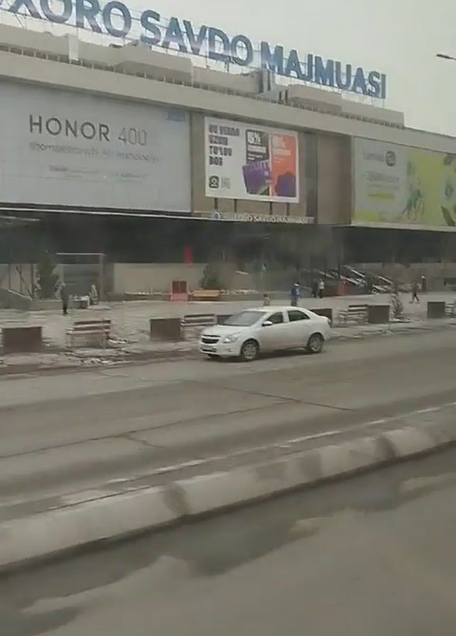 exterior of a building labeled “Buxoro Savdo Majmuasi” in Uzbekistan as seen from a moving vehicle