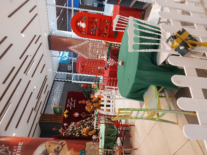 - "An indoor Christmas display features a decorated tree with teddy bears, surrounded by small, colorful chairs and tables draped with green tablecloths" by FM-71cTG2, licensed under CC BY 4.0