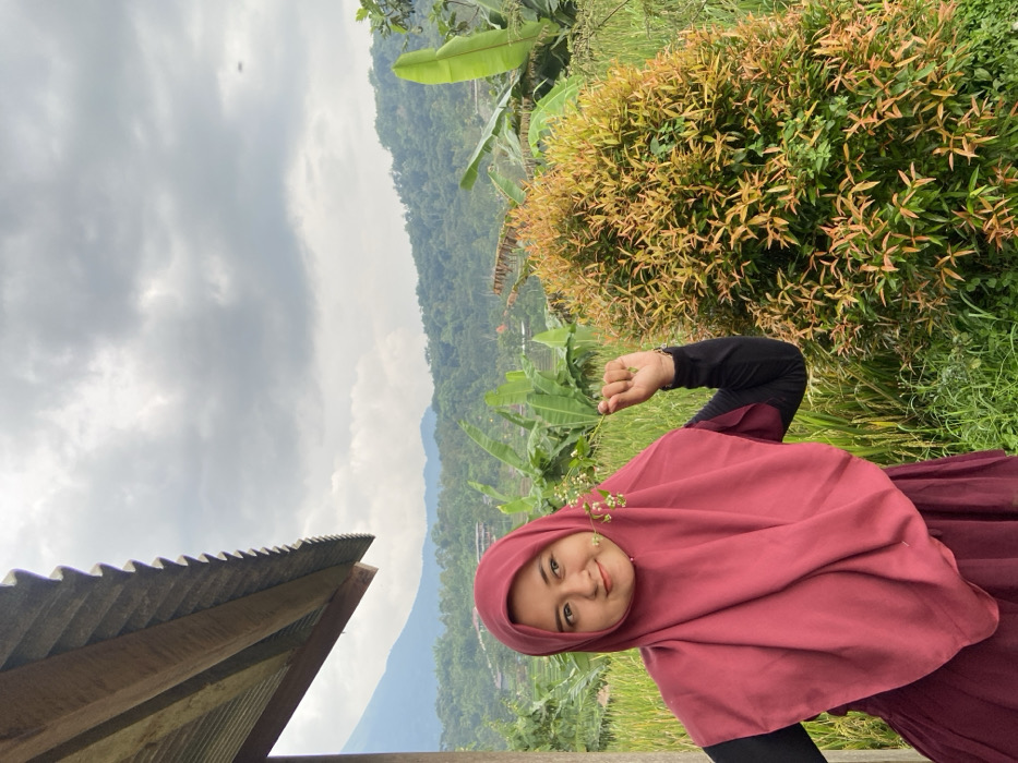 The image depicts a female individual in Tamiajeng, Indonesia, against a natural landscape