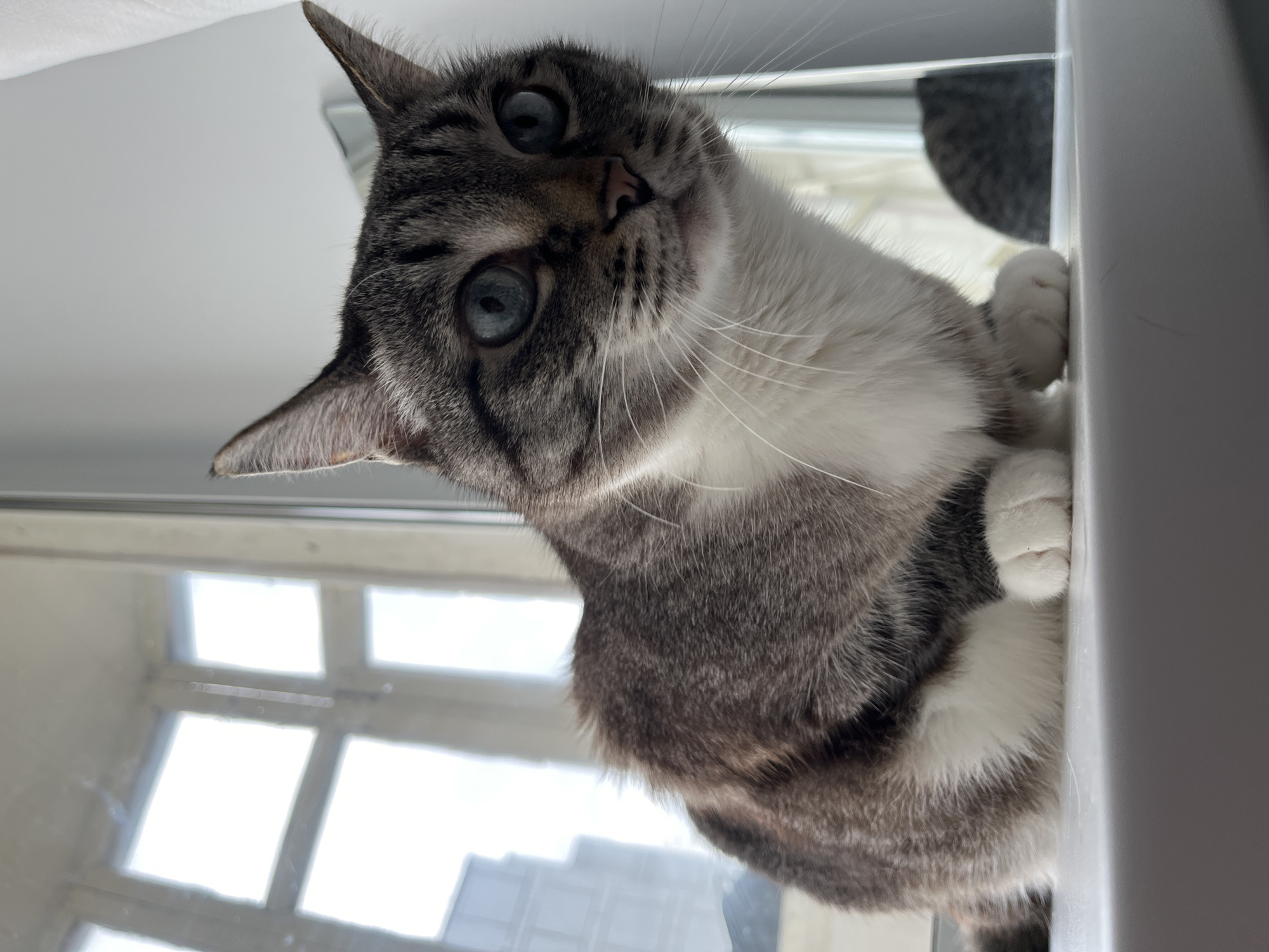 A cat with gray tabby markings and white chest and paws peers down at the camera from an elevated position. The cat has striking blue eyes. The background includes a window with multiple panes and what appears to be part of a cat tree. There is no definitive information to place the location in Chaikovsky, Russia.