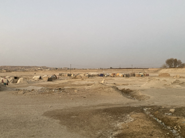 The image displays an informal settlement situated in an arid, open landscape in Kuchlak, Pakistan, under a pale, hazy sky