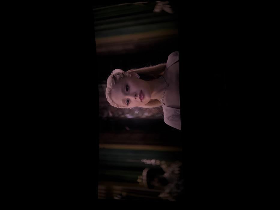 A fair-skinned woman with light blonde hair looks directly at the viewer. She has fair skin, long eyelashes, and light pink lips. A silver necklace adorns her neck, and a light-colored garment covers her shoulders. The background appears to be outdoors, possibly a garden, with blurred greenery and dark shadows. The woman is the primary focus, and the overall image has a cinematic and slightly dreamlike quality.