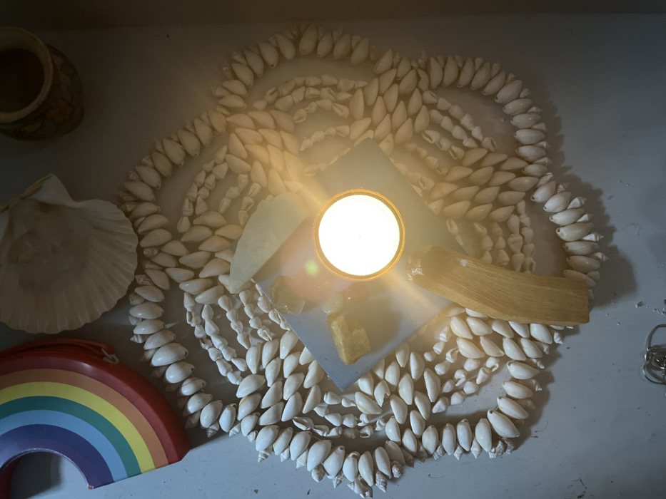 An overhead shot displays an arrangement of static objects on a light-colored surface, under dim ambient lighting with a strong central illumination. A lit candle in a golden-rimmed, circular holder is centrally positioned, emitting a bright white light with a visible lens flare. This candle rests on a light blue-grey square tile. On the tile, to the left of the candle, are several small, irregular yellowish-brown objects, alongside an elongated, flat, pale green or blue stone positioned towards the top-left of the tile. Below the tile, a piece of light-colored, unshaped wood, possibly Palo Santo, extends downwards. Surrounding these central items is an intricate, multi-layered arrangement of numerous small, off-white, teardrop-shaped shells (likely cowrie shells), forming a complex, curvilinear pattern. In the upper-left quadrant, a small, rectangular object with distinct horizontal rainbow stripes (red, orange, yellow, green, blue, indigo, violet) is visible. To its immediate right, partially overlapping the shell arrangement, is a large, ridged, fan-shaped seashell. In the upper-right corner, a small, cylindrical, carved wooden vessel is present. The surface beneath all objects is uniform, light grey or off-white. No individuals are present. The image provides no identifiable features or details pertaining to a specific location within Marseille, France.