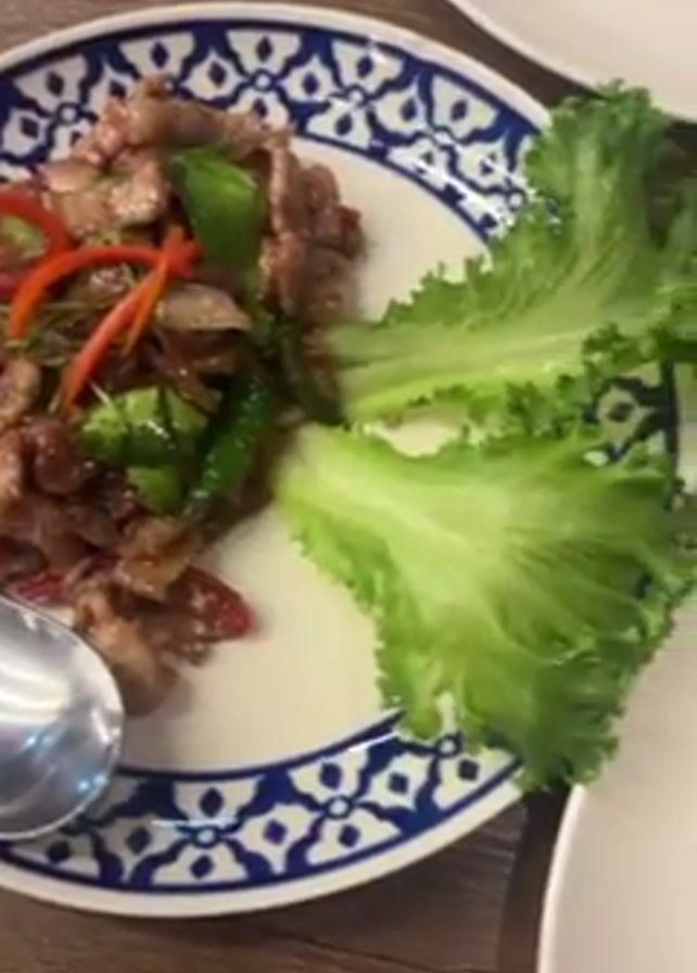 table with several plates of Thai food. One plate has a dish of stir-fried meat with peppers and basil, garnished with lettuce. Next to it is a plate of white rice formed into a rounded mound. There is also a plate of small, fried dumplings. A spoon sits beside the stir-fried meat dish. The table is a wood-grain surface, and there are sounds of other people talking in the background.