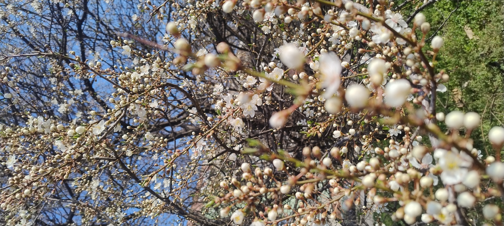The image presents a close-up, vertical perspective of a deciduous tree or shrub in full bloom, located in the city of Sofia, Bulgaria. The subject's branches are densely laden with numerous small white flowers and unopened white buds. Foreground branches featuring buds and partially open blossoms are rendered with a shallow depth of field, appearing significantly blurred. Midground elements are in sharp focus, revealing individual white flowers, each typically displaying five petals and a visible yellow stamen cluster, alongside abundant spherical white buds. The branches themselves are bare of green foliage. The background consists of a clear, bright blue sky visible through gaps in the upper tree canopy and a blurred expanse of green vegetation, consistent with ground cover, in the lower portion of the frame. No human figures, animals, or specific man-made structures are present within the view.