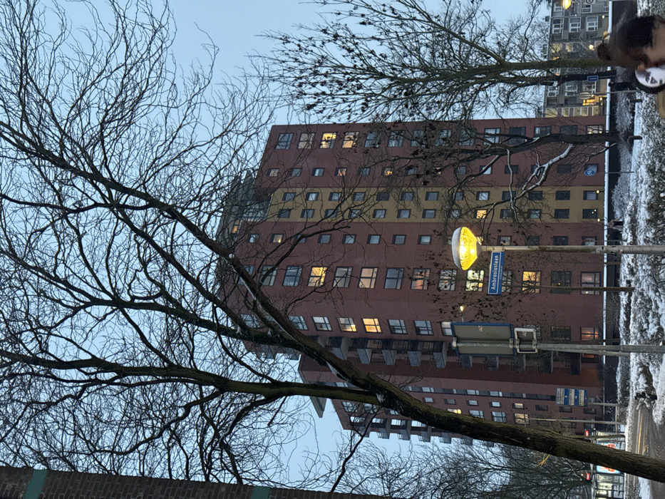 A tall, red and yellow apartment building with many windows stands behind bare winter trees. A street sign labeled "Ambrosiuslaan" is visible near a lit street lamp. The sky is overcast. Some snow is present on the ground and along a barrier. A person is partially visible to the right of the image.