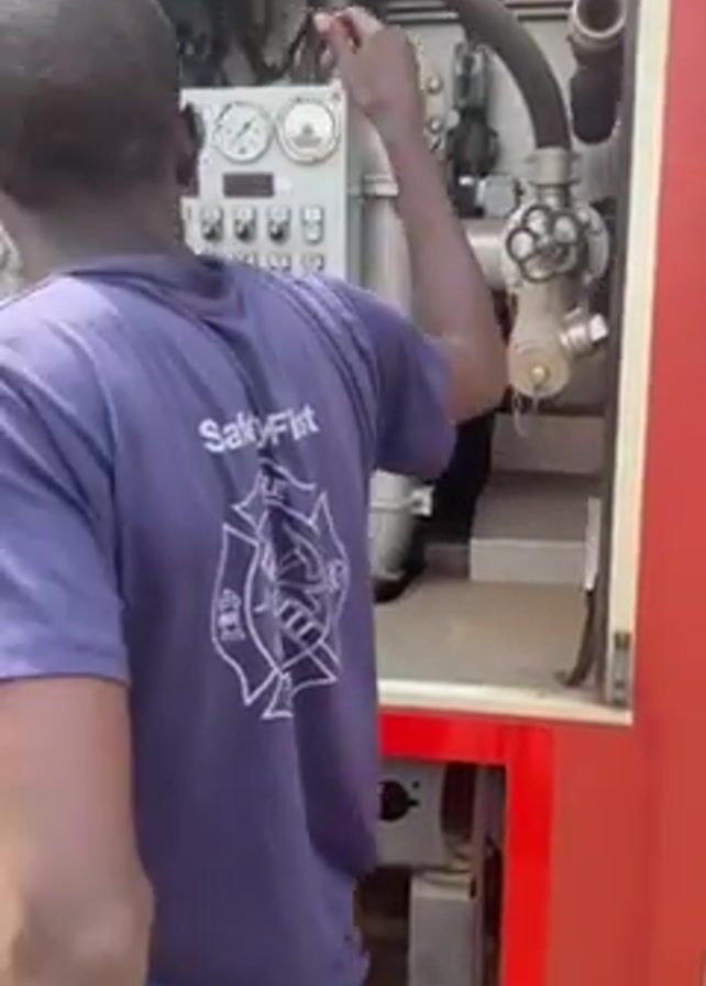 person standing next to a red and white fire engine looking at the water pump system. The pump system is located behind a panel on the side of the truck. It has a series of pipes, valves, gauges, and switches. The person in the video is wearing a blue shirt and appears to be inspecting the pump. The camera pans across the pump assembly.