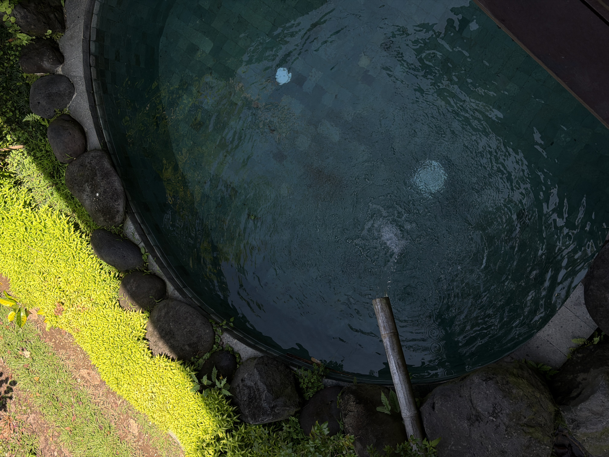 An overhead, high-angle shot depicts a circular plunge pool situated outdoors in Kedewatan, Indonesia. The pool contains dark teal-colored water with visible, lighter-toned square tiles arranged in a patterned formation on its bottom. A light-colored, disc-shaped object floats near the upper right quadrant of the water's surface. From the left side of the frame, a segment of a light-brown bamboo pipe extends horizontally over the pool, discharging water that creates distinct ripples and surface agitation. The pool's perimeter is lined with a series of dark, irregularly shaped boulders. Beyond these stones, a vibrant strip of bright, chartreuse-green ground cover runs in a curved line, separating the pool area from a patch of darker green grass and sparse vegetation. Portions of the scene, particularly the stones and vegetation on the left, are partially shadowed, indicating direct sunlight elsewhere. A dark brown wooden edge is visible along the bottom right margin, suggesting an adjacent platform or structure. No individuals are present in the scene.