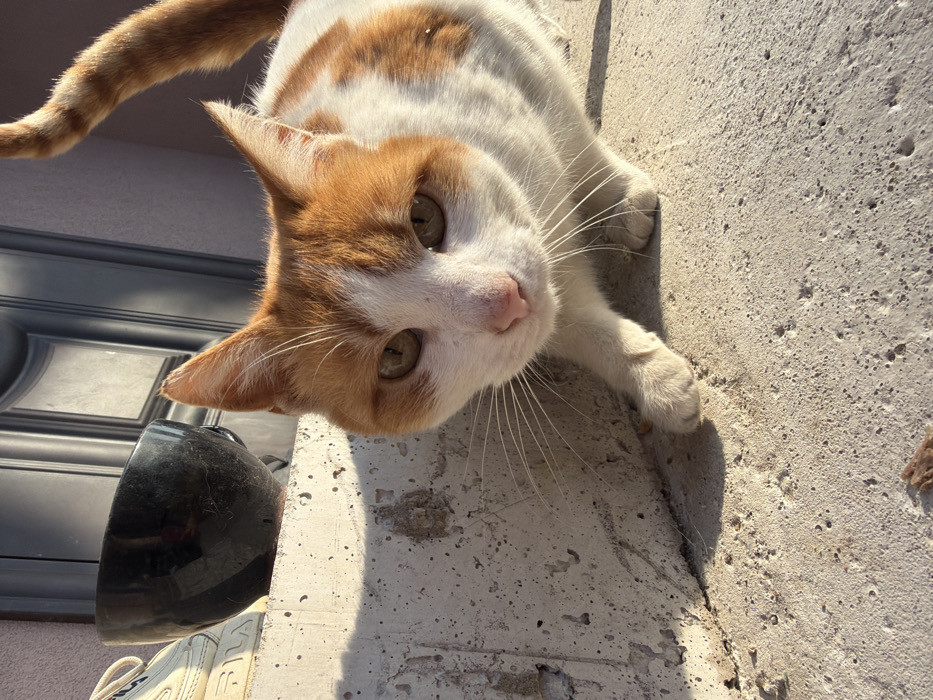 The image depicts a domestic cat, specifically a bi-color feline with white fur and irregular orange/ginger patches, primarily on its head, back, and tail. The cat is positioned in the foreground, low to a light-colored, textured concrete surface, with its head turned towards the observer. Its eyes are a brownish-amber color, and its pink nose is visible. White whiskers extend from its muzzle. The cat's front left paw is extended forward on the concrete. To the immediate left of the cat, a rough concrete ledge casts a distinct shadow. Resting on this ledge are a black, possibly ceramic, bowl or cup and a portion of a white athletic shoe. In the background, a dark, paneled door or gate is visible against a light-colored wall. The scene is illuminated by strong natural sunlight from the left, creating sharp shadows. A small, dark, irregular object, possibly organic matter, rests on the concrete surface in the lower-left corner. This scene is situated in the city of Kilifarevo, Bulgaria.